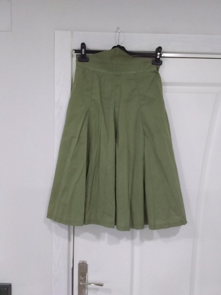Haki renkli, keten kumaştan yapılmış, pilili ve bol kesim midi etek. Minimalist ve normcore tarzıyla günlük kullanıma uygundur. etek, tasarım etek, ofis stil, astarlı, keten ince kumaş, yandan fermuarlı, kopçalı, bel ön kısım Ters V şeklinde, asker yeşili bel ölçüsü 35cm+35cm, boyu 70cm, astar ve kumaş tok hafif kabarık modellik veriyor, tarz, ofis, büro, sokak, çok amaçlı