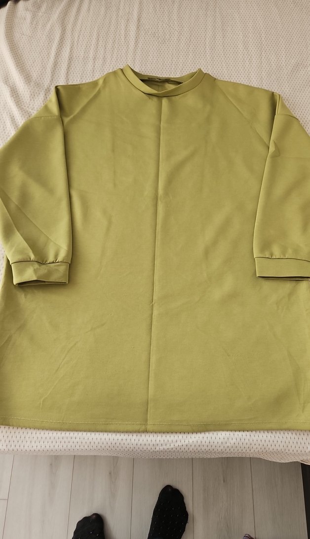 Haki renkte, yuvarlak yakalı ve uzun kollu, salaş kesim sweatshirt. Yumuşak pamuklu kumaştan, günlük ve minimalist sokak stili için uygun, midi boyda. çok belli belirsiz lekeler vardır