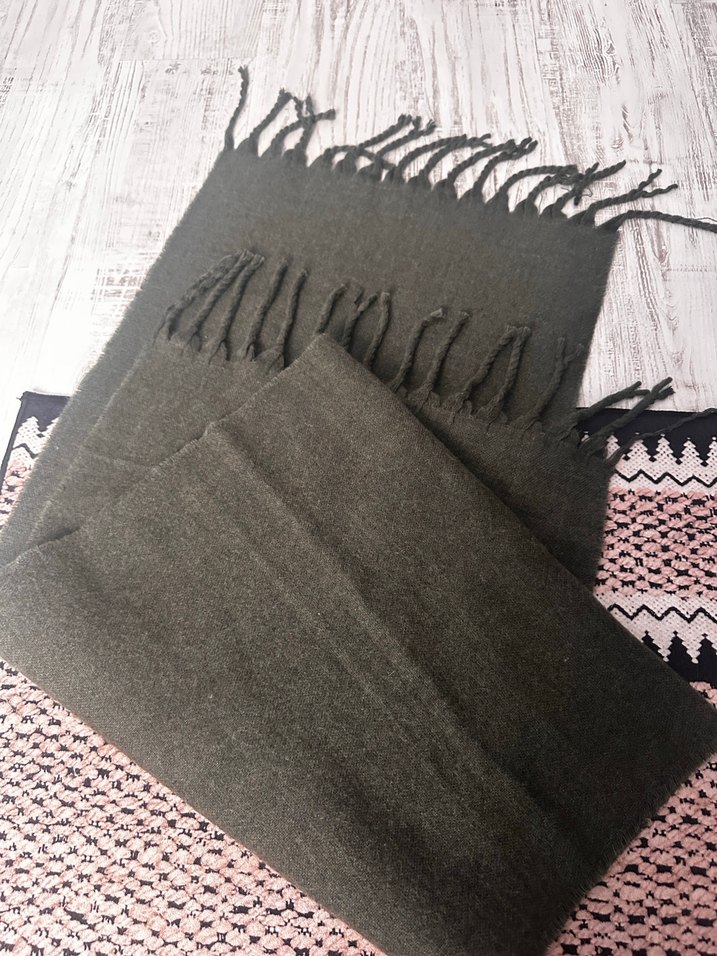 Haki renkli, örgü dokulu ve püsküllü kenarlarıyla bohem tarzda, rahat bir kadın şalı. Yumuşak tekstil malzemeden üretilmiştir. Kullanılmadı