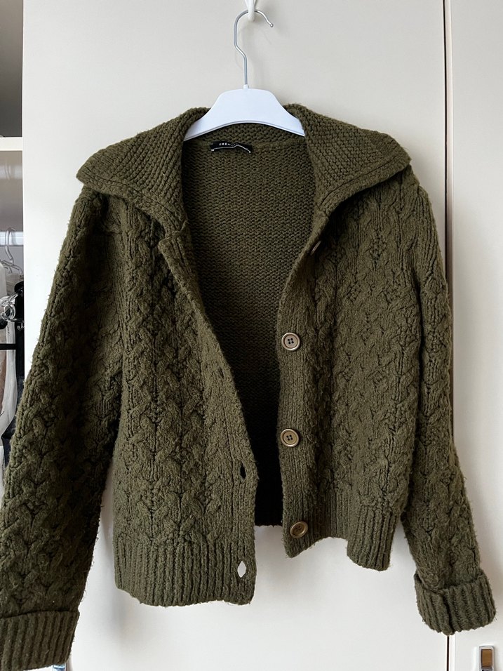 Haki örgü kadın hırka, kesilmiş yaka ve uzun kollu. Rahat kesimi ve midi boyu günlük kullanıma uygun, sade ve konforlu bir modeldir.