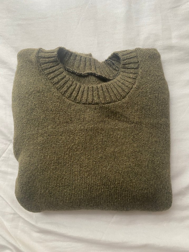 haki yesil renk, yumuşak yünden örülmüş, yuvarlak yakalı ve uzun kollu kadın kazak xs s uyumlu