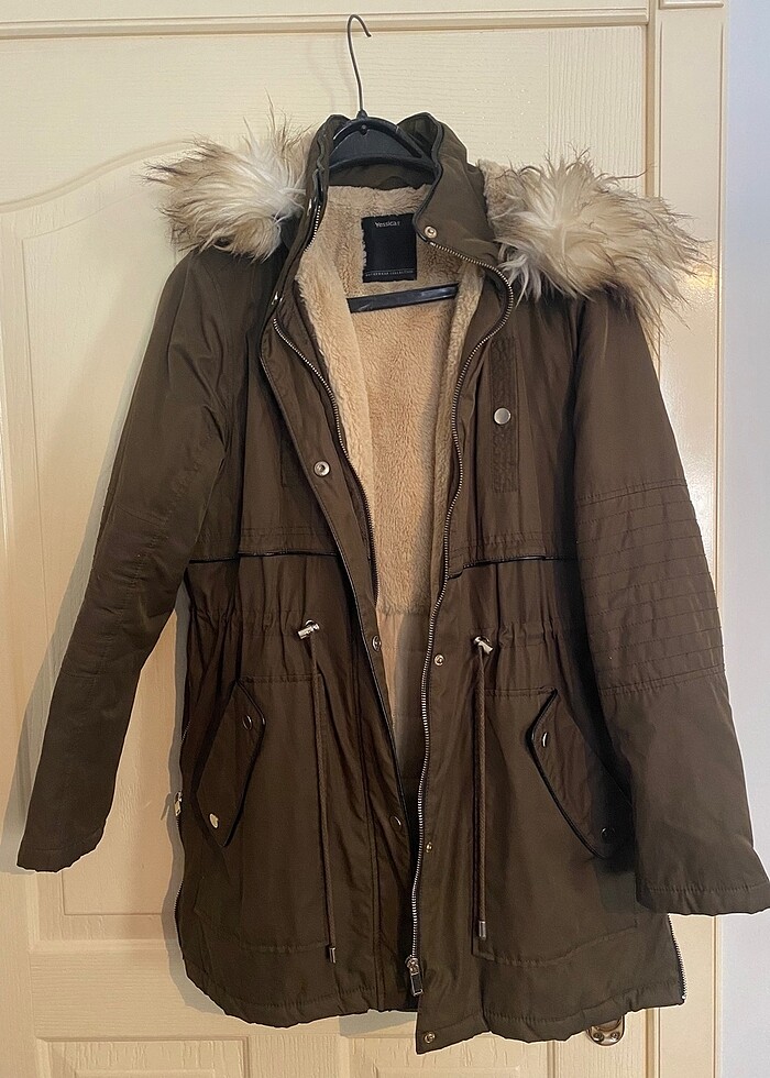 İç kısmında lekelenme mevcut fotoğrafta gösterdim. Kürkü çıkartılabiliyor. Beli ayarlanabilir. Yanlarda da fermuarları mevcut.