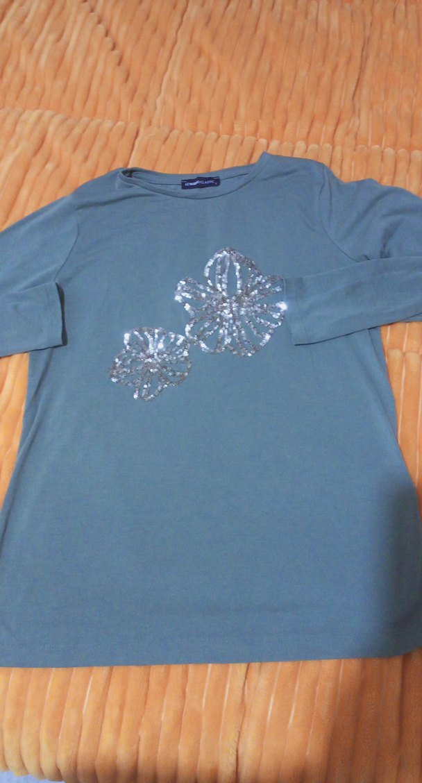 haki renkli, uzun kollu ve yuvarlak yakalı, payet işlemeli çiçek desenli rahat giyim penye