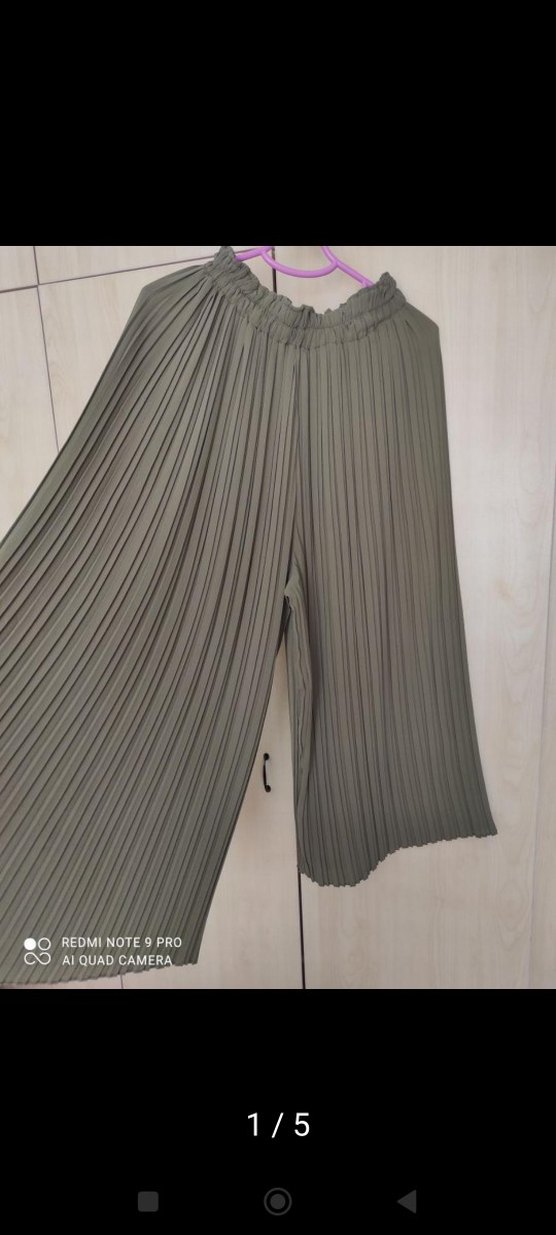 Bol kesim, uzun haki yeşil pileli şık pantolon, günlük rahat kullanım için uygundur. Bir kez giyildi. Küçük geldigi için satıyorum.