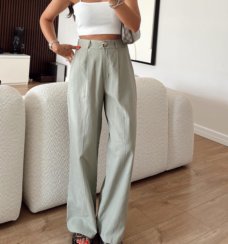 Haki renkte, keten kumaştan, düğmeli ve midi boyda kadın pantolonu. Günlük rahat kullanıma uygun, çağdaş tarzda ve normal kesim.