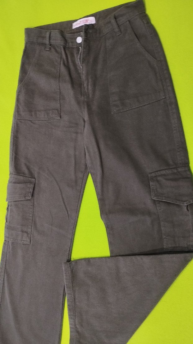 haki renkte, rahat kesim ve uzun boyda, yumuşak gabardin kumaştan yapılmış kadın kargo pantolonu, günlük sokak stili için uygundur.