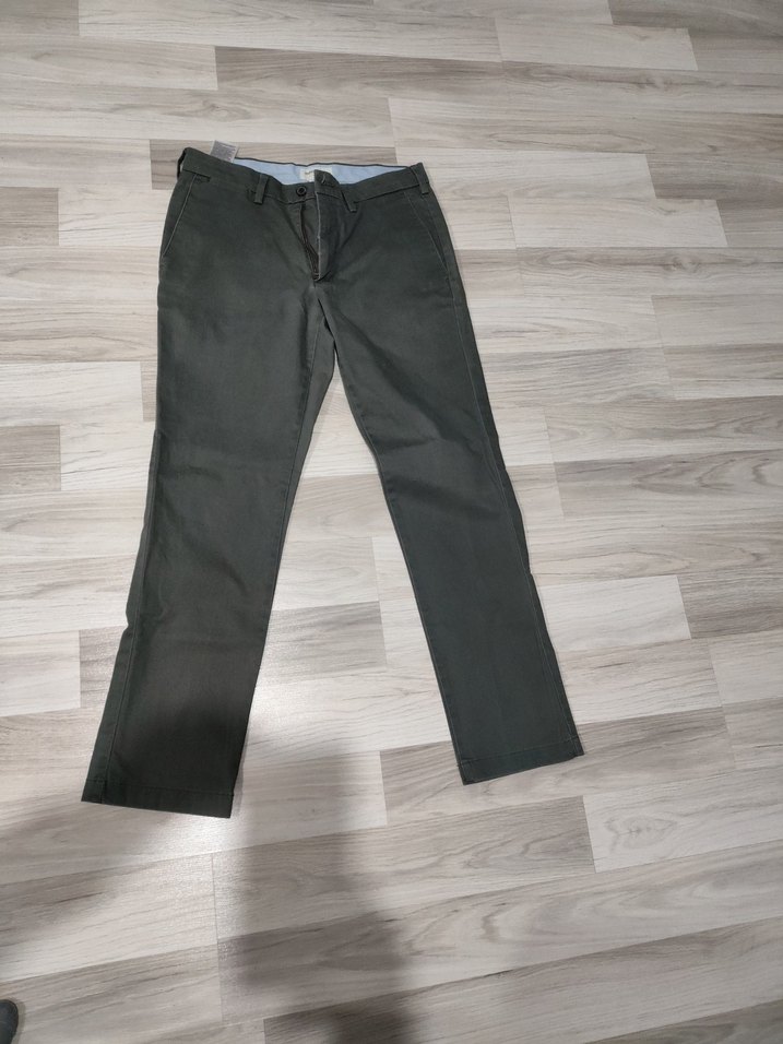 Haki renkli, regular fit erkek denim pantolon, kemerli ve normal boyda. Ofis ve günlük kullanıma uygun, desen içermeyen sade tasarım.