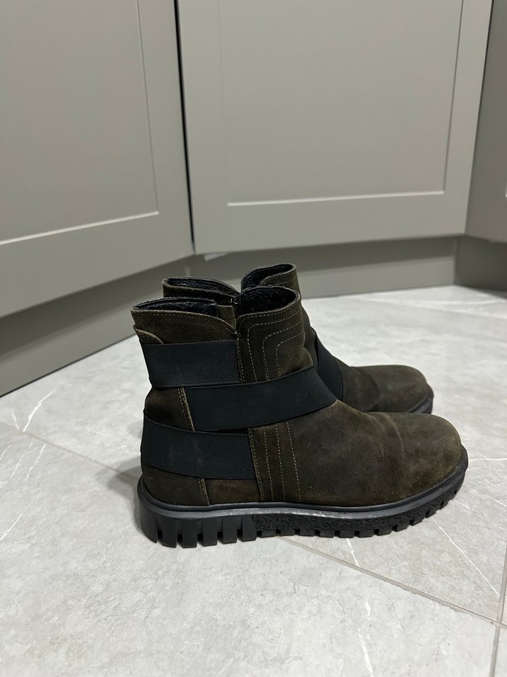 Haki rengi süet kadın botları, dolgu topuklu ve kemerli tasarıma sahip, dayanıklı tabanlı, sokak stili için uygun.