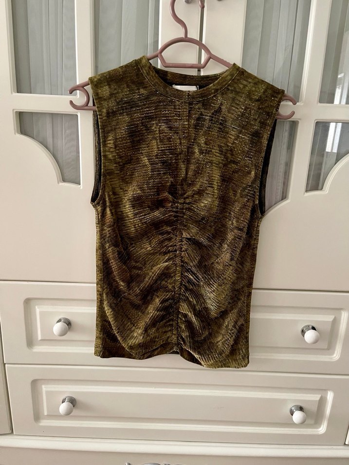 Haki tonlarında sentetik kumaştan, yılan desenli, kolsuz, balıkçı yaka ve pileli kısa kesim, dar kesim bluz.