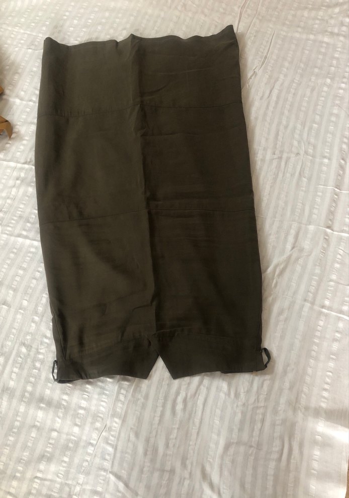Haki renk keten kumaştan, kemerli ve midi boyda, vücuda oturan sade ve minimalist tarzda etek. Günlük kullanıma uygun.