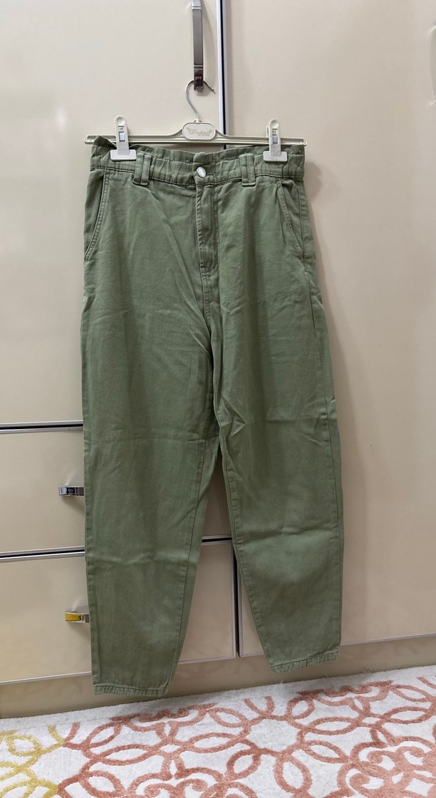 Haki Renk Bol Kesim Keten Kumaş Kadın Pantolon