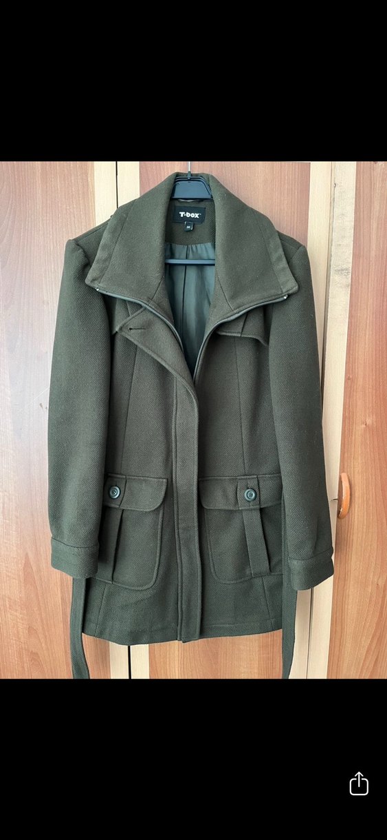 Haki renkli, düğmeli kapaklı ceplere ve kemere sahip, yumuşak ve sıcak kumaştan yapılmış kaşe kabandır. Geniş yakalı ve uzun kolludur. Ürünü az kullandım deformesi yoktur ve temizdir 36 ve 38 bedene uygundur