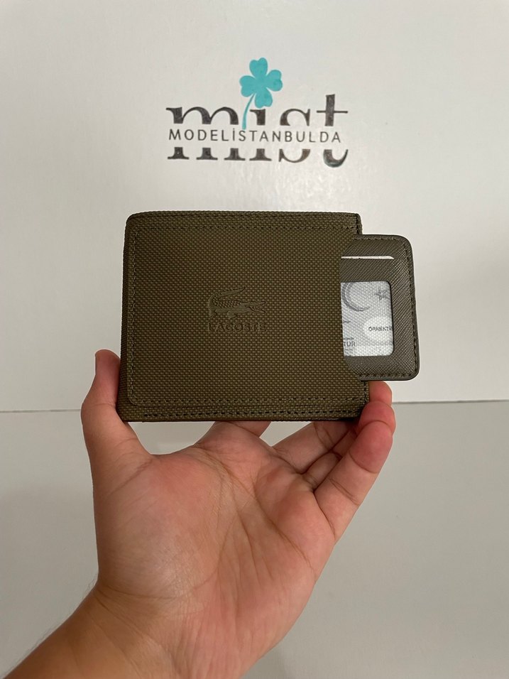 Ön dış kısmında LACOST timsah logo marka sıcak baskı bulunan,GENEL TOPLAMDA 13 ADET KARTLIK GÖZÜ OLAN,cüzdanın iç kısmında 10 adet kartvizit gözü bulunan,2 adet iç kısımda koyma gözü mevcut olan,2 adet kağıt para gözü olup,dışta 1 adet çıkıp takılabilen kartvizit gözü olan ve ekstra tek başına da kullanabileceğiniz 2 adet düz gözlü,1 adet ise şeffaf gözü olan kartvizitliği mevcut olan haki renk suni deri cüzdan. CÜZDAN EN:11,5 CM YÜKSEKLİK:9,5 CM KARTVİZİTLİK EN:9,5 CM YÜKSEKLİK:7,5 CM