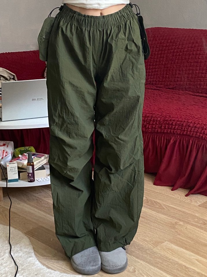 Koyu haki renk keten kumaştan, geniş paça ve midi boyda, desen içermeyen rahat kesim pantolon. Günlük kullanım için şık ve rahat bir tercih.