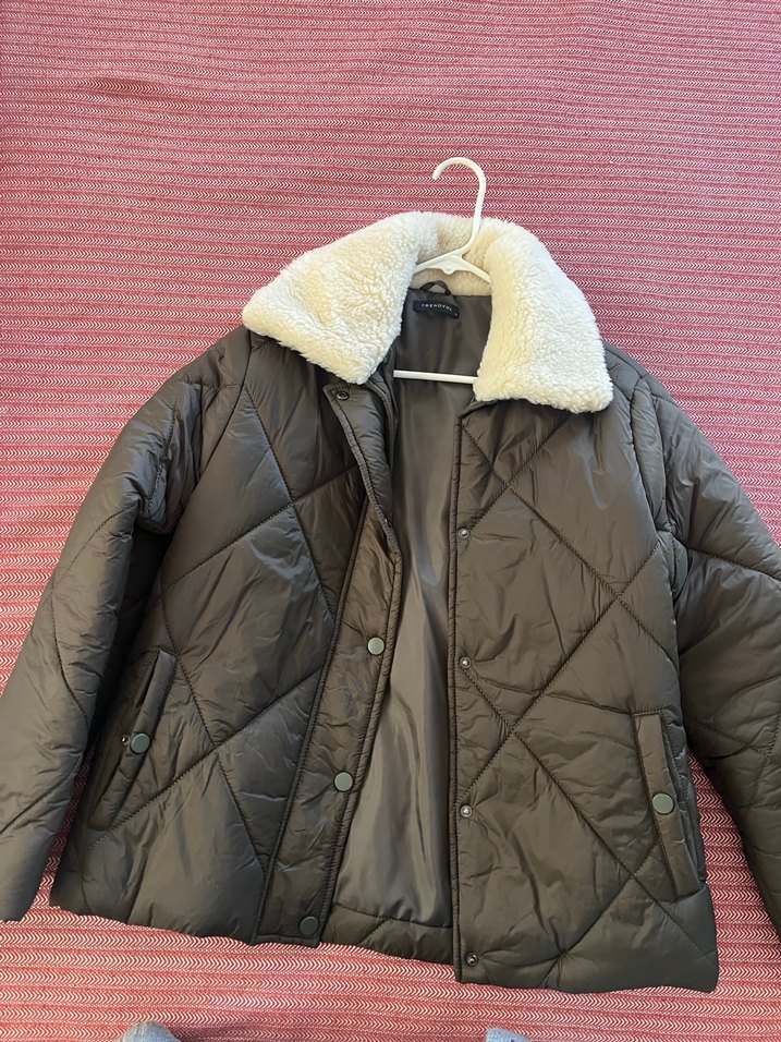 Kahverengi, yumuşak dokulu, kürklü yakalı ve çıtçıtlı, uzun kollu, midi uzunlukta, rahat ve şık kadın kışlık mont.