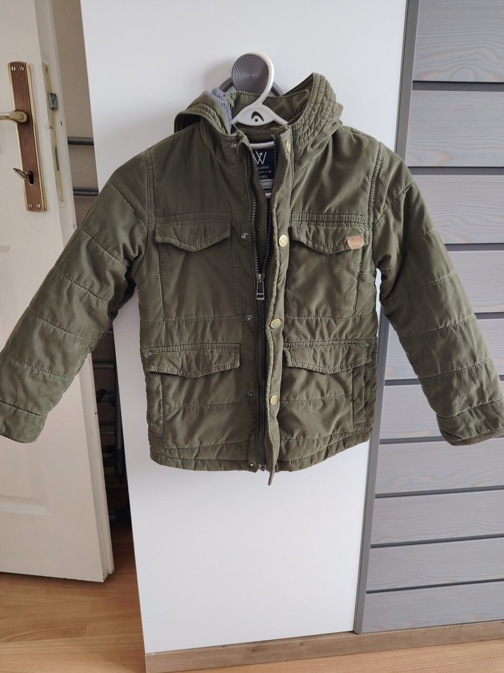 Haki renk kamuflaj desenli, düğmeli ve kesimli yakalı erkek çocuk montu, yumuşak ve sıcak kumaştan üretilmiştir.