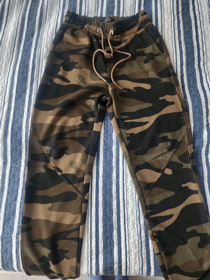 Kahverengi kamuflaj desenli kadın pantolon, bol kesim ve kemerli. Sentetik kumaştan, dış mekan ve sokak stili için uygundur. xs beden yeni hiç kullanılmamış etiketli