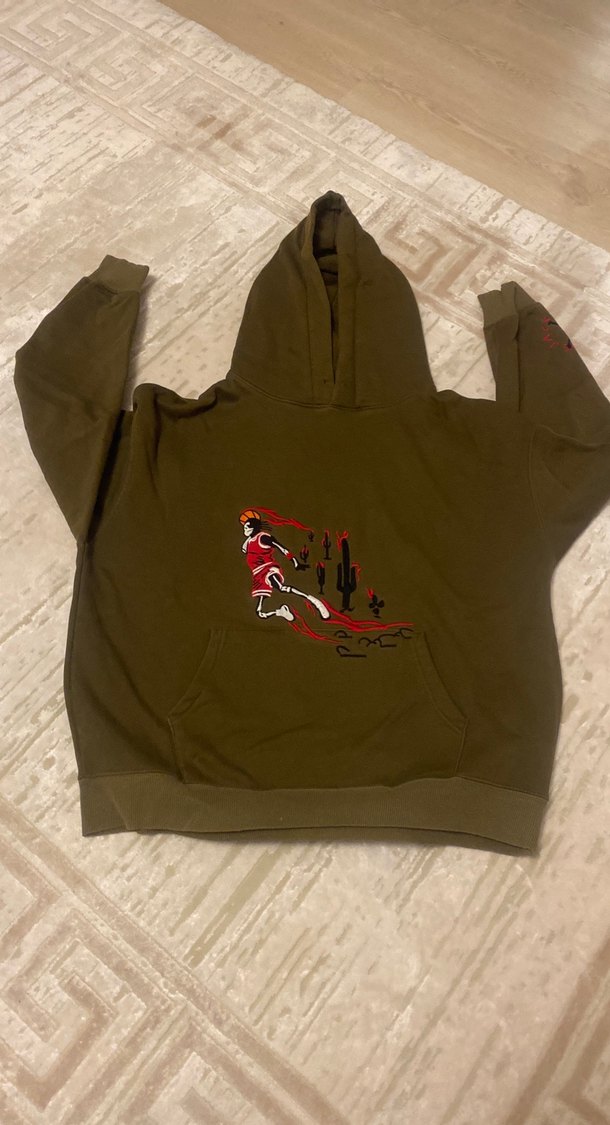 haki renk kapüşonlu sweatshirt, uzun kollu ve bol kesimdir. Önünde baskılı desen ve Yumuşak ve sıcak kumaştan yapılmıştır.