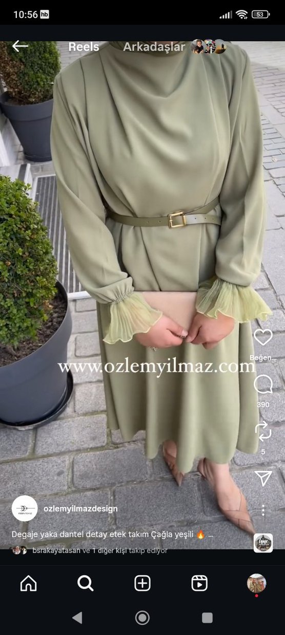 Haki renk, kemerli ve bol kesim uzun kadın elbise.