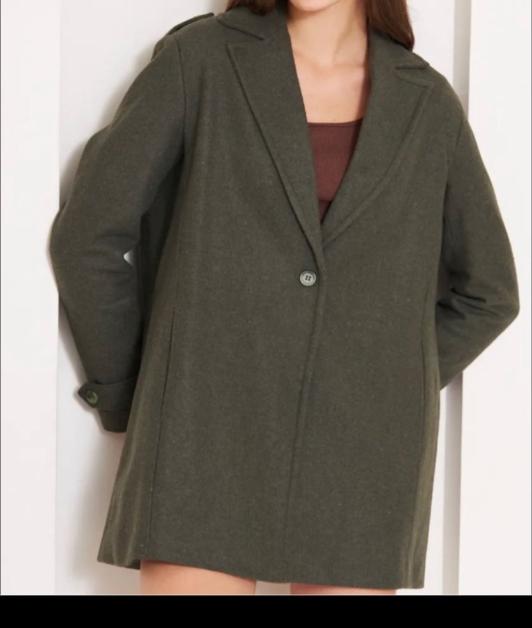 Tek düğmeli, yaka detaylı ve yumuşak, sıcak kumaştan yapılmış haki renk kaban. Şık ve düzgün kesimlidir.
