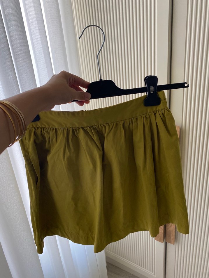 Haki renkte, pilili ve bol kesim midi mini etek. Yumuşak sentetik kumaştan, minimalist ve bohem tarzına uygun, günlük kullanım için.