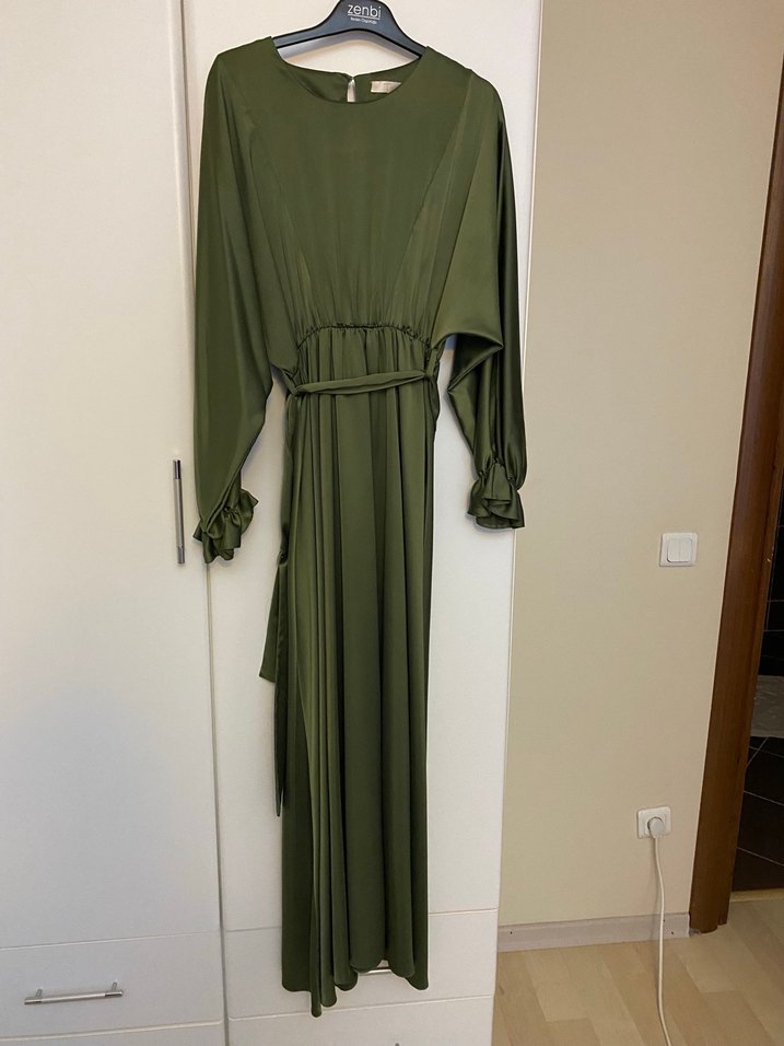Haki renk, piliseli uzun elbise; bol kesim, uzun kollu ve fırfırlı manşetlere sahip. Modern klasik tarzda, sade ve şık görünüme uygun.