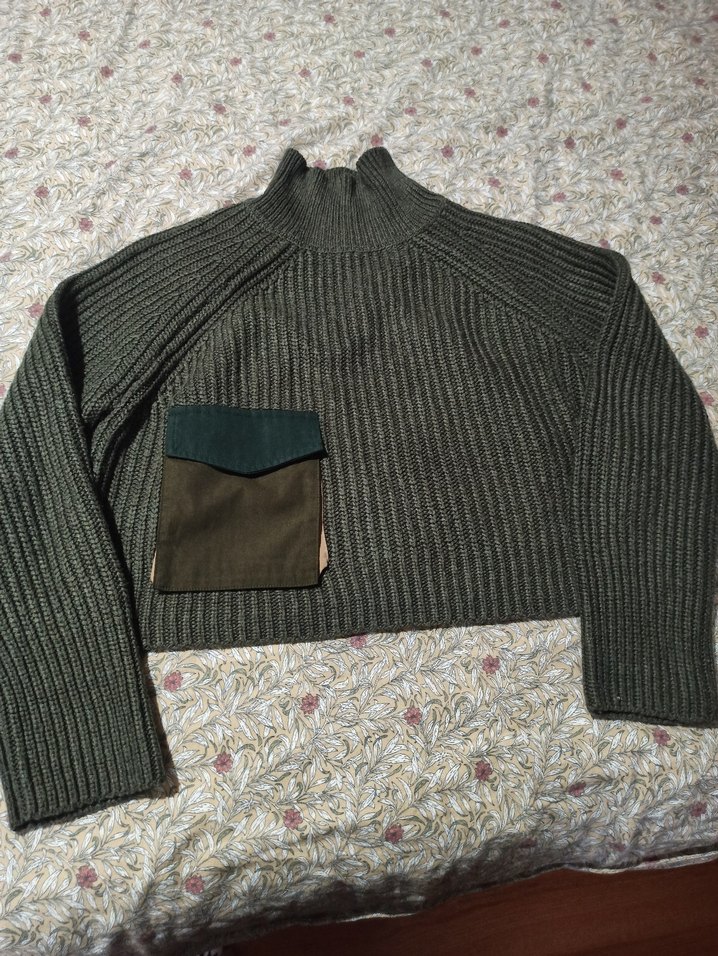 Haki renkli, balıkçı yaka ve uzun kollu triko kazak. Salaş kesimi ve midi boyu ile rahat bir stil sunar. Kontrast cepli detaylıdır.