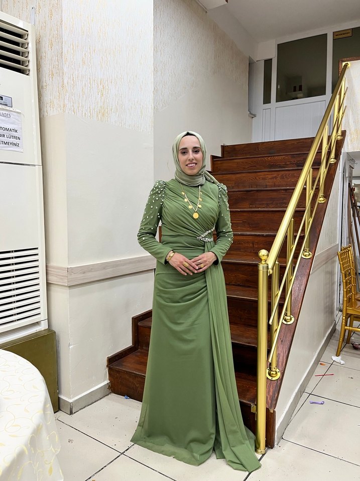 Haki Renk Uzun Kol Drapeli Tesettür Abiye