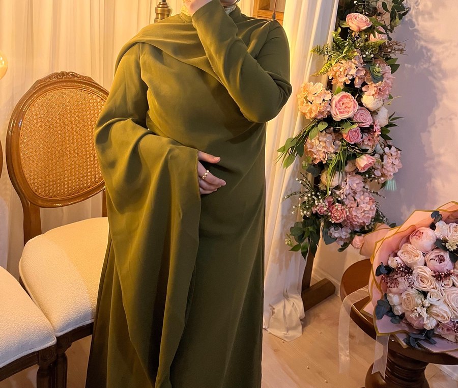 Haki renk uzun elbise, yüksek yakalı, uzun kollu, salaş kesim ve dökümlü yumuşak kumaş ile sade ve bohem tarzda rahat bir görünüme sahiptir.
