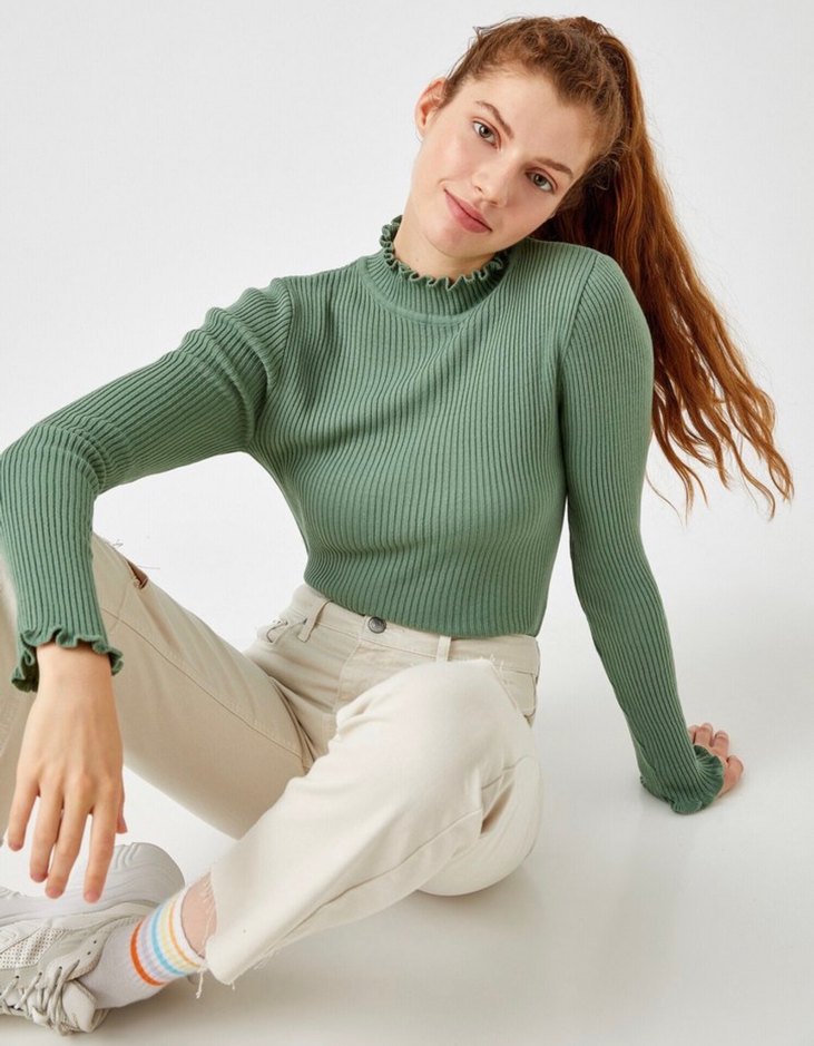 Yüksek yakalı, uzun kollu ve fırfırlı kenarlara sahip fitilli triko kazak, pastel yeşil renkte casual normcore stil sunar.