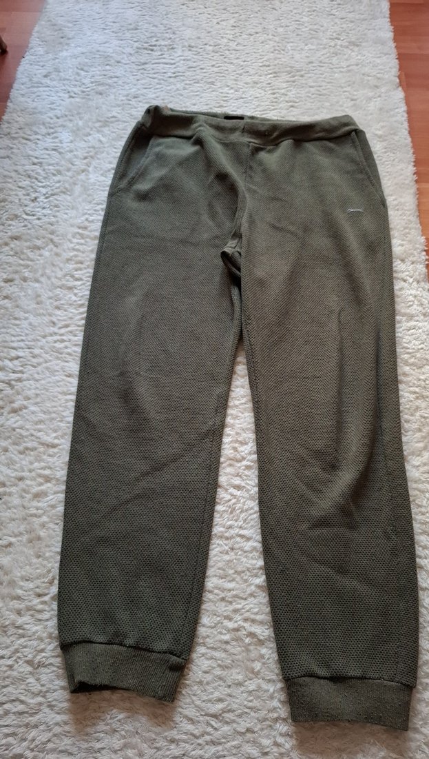 haki renkte, kemerli bel ve bol kesime sahip erkek eşofmanı. Yumuşak sentetik kumaştan üretilmiş, günlük rahat kullanım için uygun sokak stili pantolon.