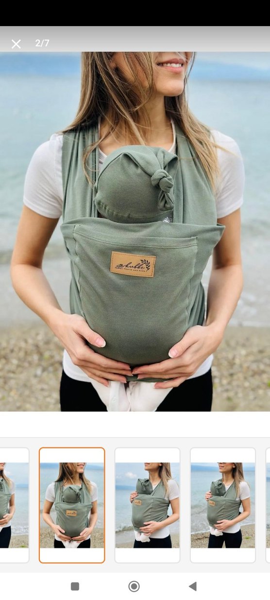 Haki renkte, yumuşak ve güvenli kumaştan yapılmış bebek kanguru sling. Bebeği nazikçe destekler, ellerinizi serbest bırakır. Sadece iki kez kullandım hiç yıkamadım dahi hiçbir deformesi yoktur.