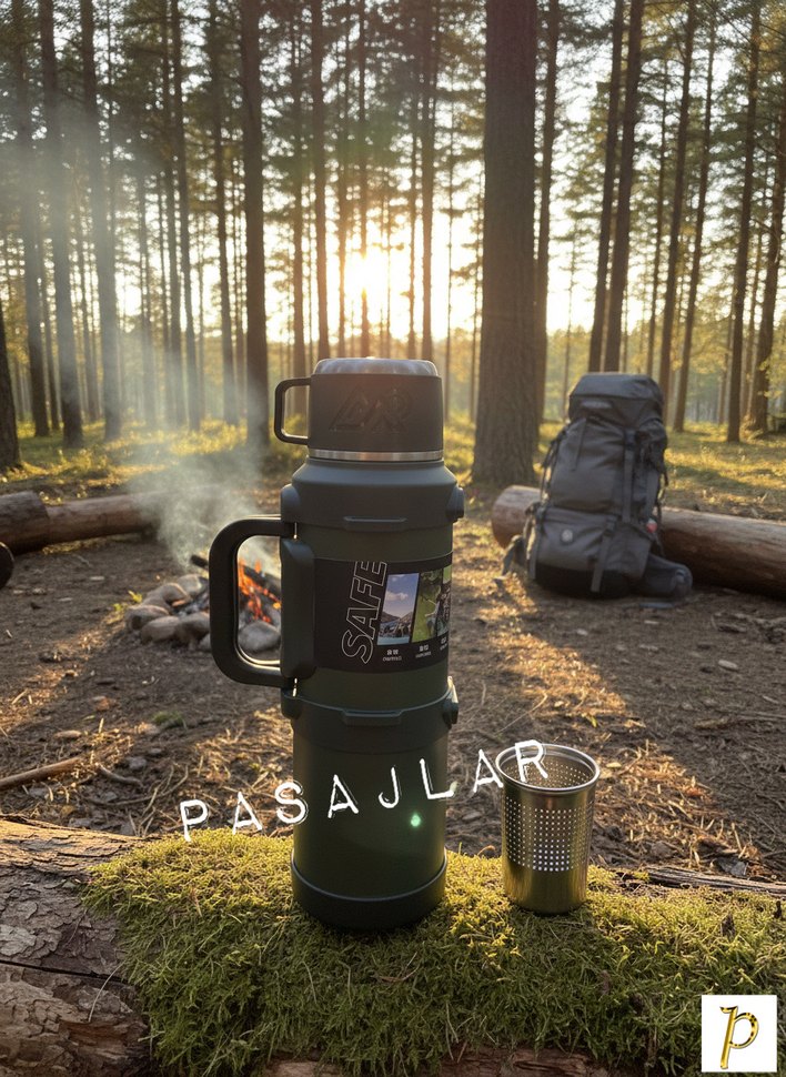 Haki renkte, sağlam saplı çelik termosu. Metal süzgeci bulunur, içecekleri sıcak tutar. Doğa aktiviteleri için uygundur. ☕