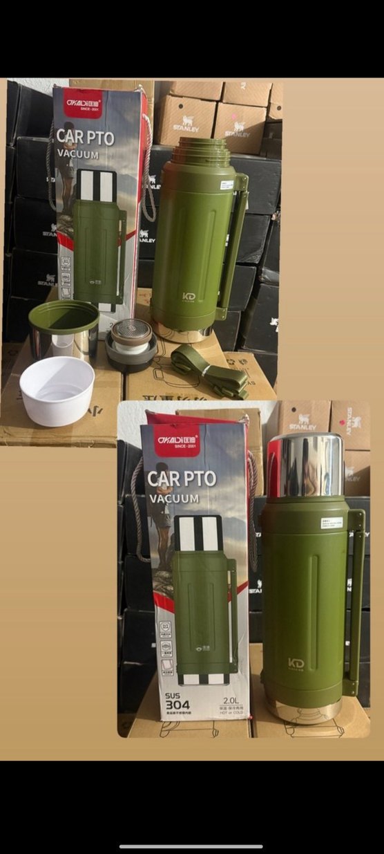 Haki renkli çocuk termos şişesi, vakumlu yalıtımla içecekleri sıcak tutar. Bardak ve sağlam kapak içerir, taşıması kolay sapı vardır. Marka adı "CARPTO" görülmektedir. 2 LT