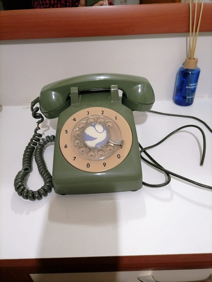 markanın haki renkte döner tuşlu telefonu, gri kadranlı ve kıvrımlı kablolu klasik tasarım.