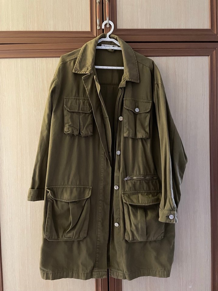 Haki renkli, düğmeli ve salaş kesim kadın ceket. Uzun kollu, çentikli yaka ve çoklu ceplidir. Keten kumaştan, günlük kullanıma uygun rahat bir sokak stili ceket.