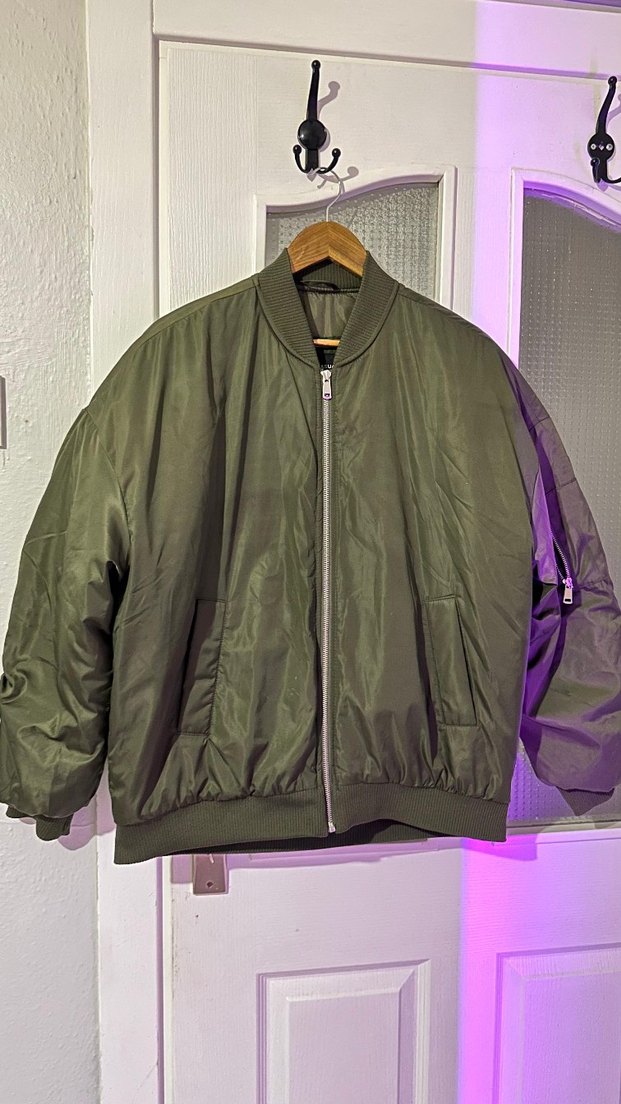 Haki renkli, fermuarlı, salaş kesim kadın ceket. Uzun kollu, bisiklet yaka ve midi boyda, sentetik kumaştan üretilmiştir. yeni üründür 1 kere giyinildi bir sorunu yoktur 40 bedendir oversize sevenler için çok spor ve şık duran üründür