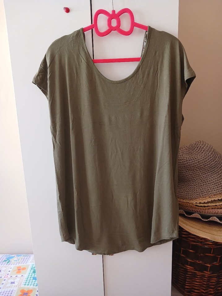 Haki renkte, yuvarlak yaka ve kısa kollu, salaş kesim, yumuşak viskon kumaştan, rahat sokak stili için uygun. 1 kez giydim bana buyuk gelince kullanamadim.