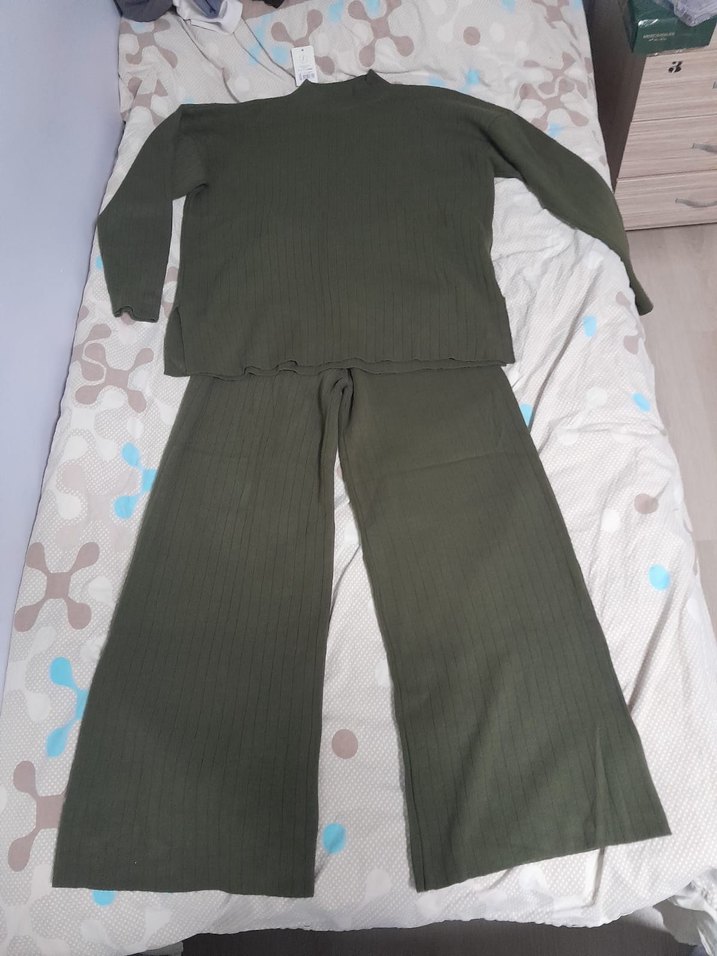 Haki renkli triko takım,uzun kollu ve yuvarlak yaka. Üst ve pantolon uzun boy, desensiz ve rahat bir kullanım sunar. standart beden.