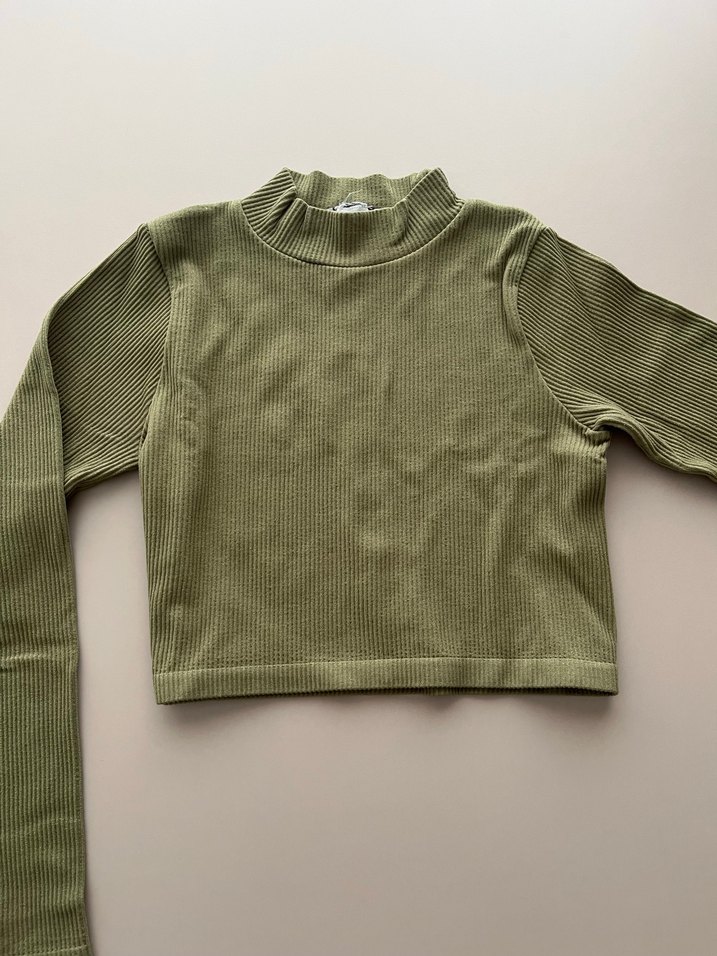 Haki Renkli Uzun Kollu Yüksek Yakalı Kadın Crop