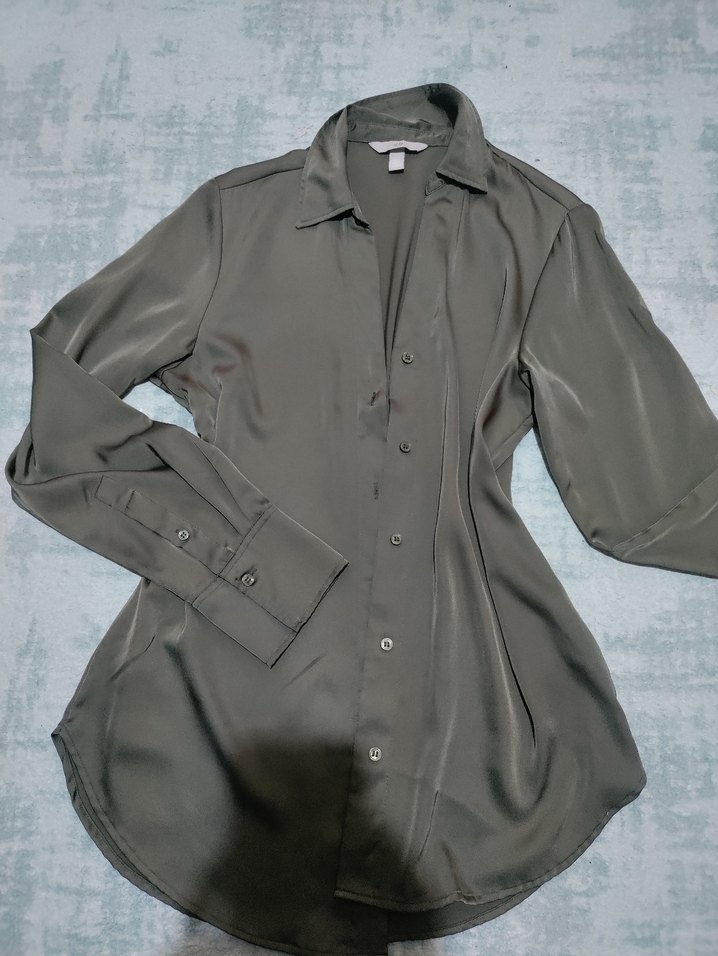 Hiç giyilmedi. Düğmeli, uzun kollu haki saten gömlek, ofis ve günlük kullanıma uygundur. Normal midi boyda rahat bir tasarım sunar. ✨