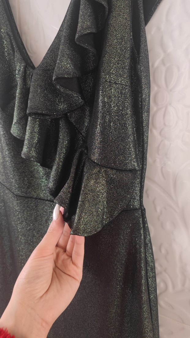 Haki simli, volan detaylı çok şık elbise. V yaka, mini boy. Hiçbir kusuru yok, tertemiz. Özel günler ve davetler için ideal. beden M L olur .