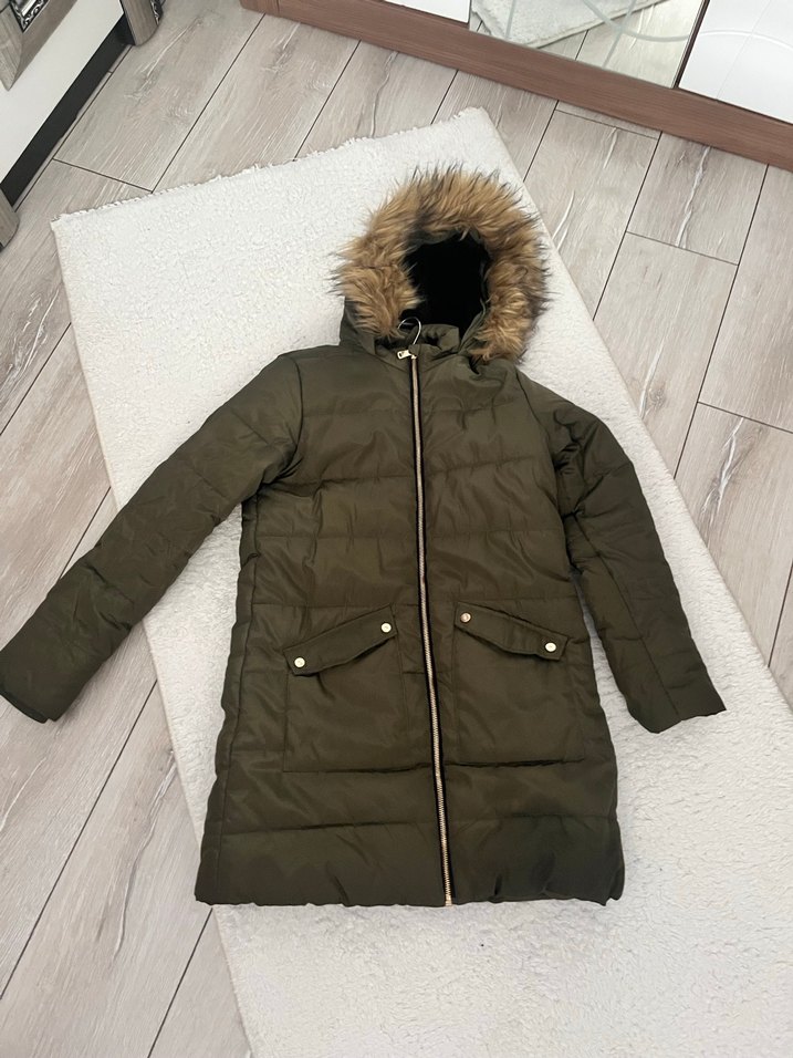 haki uzun kollu, kürklü kapüşonlu, normal midi boyda, yumuşak ve sıcak kumaştan yapılmış, rahat sokak stili için uygun, dar kesim kışlık mont.