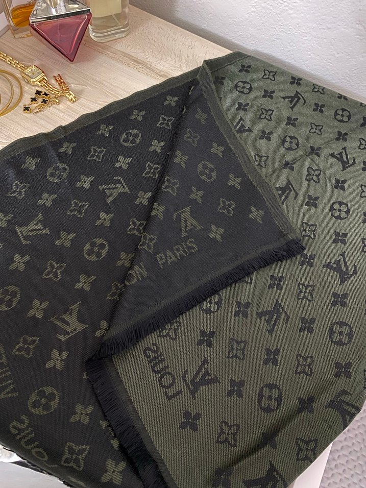 Siyah-haki renkte, Louıs vuıtton tasarıma sahip kadın şalı. Yumuşak sentetik kumaştan üretilmiş, bohem ve retro tarzlara uygun. Kumaş tok bir görünüşe sahiptir.