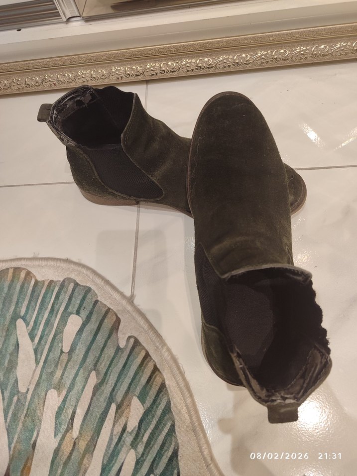 Haki süet, dolgu topuklu ve tokalı kadın botları. Günlük kullanıma uygun, rahat ve şık sokak stili için idealdir.