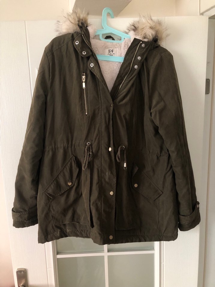 Haki süet malzemeden üretilmiş, uzun kollu, rahat kesimli kadın mont . Sokak stiline uygun, günlük kullanıma ideal.