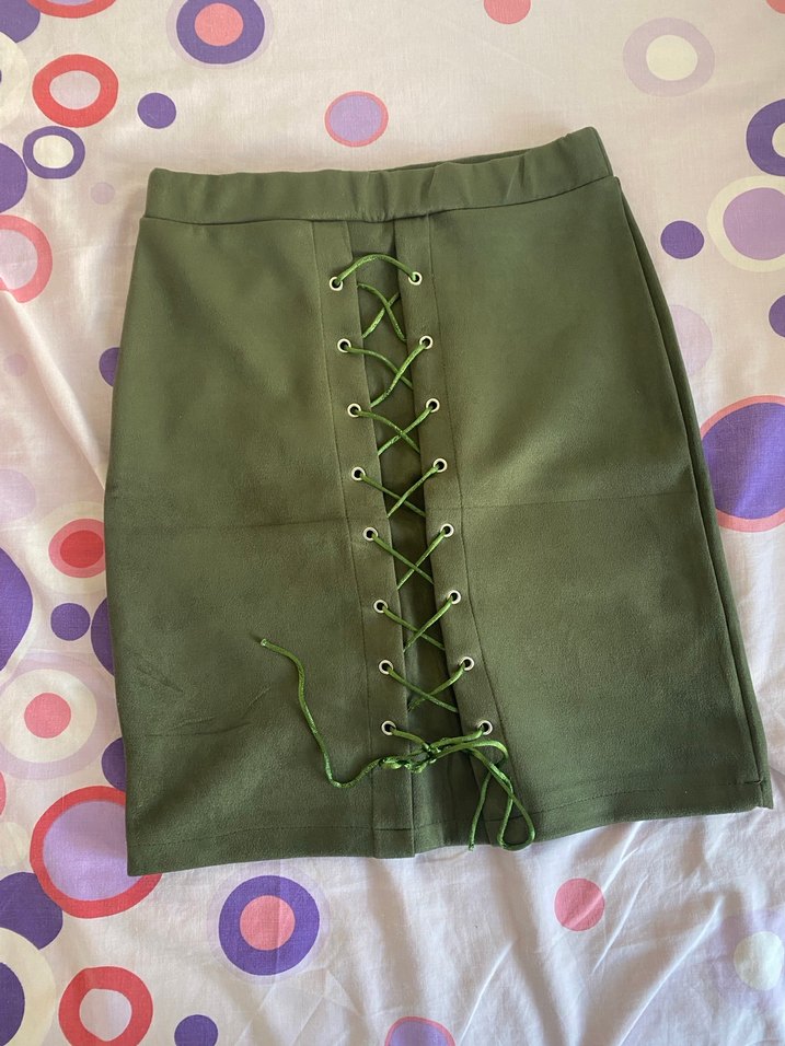 Düğmeli ve bağcıklı ön detaylı, haki renk süet kumaştan yapılmış dar kesim mini etek.