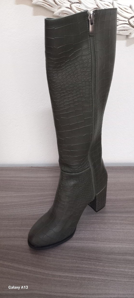Haki suni deri, yılan derisi desenli dizüstü botlar. Kalın topuklu ve tokalı detaylara sahip, günlük kullanıma uygun şık bir model.