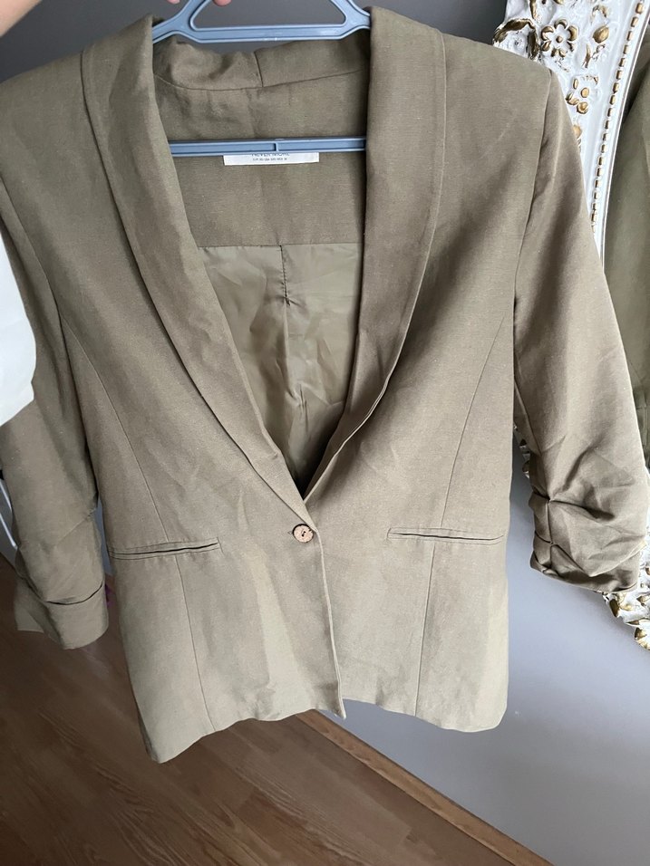 Haki renkte keten kumaştan, düğmeli, midi uzunluğunda, yarım kollu ve kesimli yakalı kadın blazer ceket. Ofis için uygun, sade ve şık tarzda. Never more markalı ürün bir kere giyildi