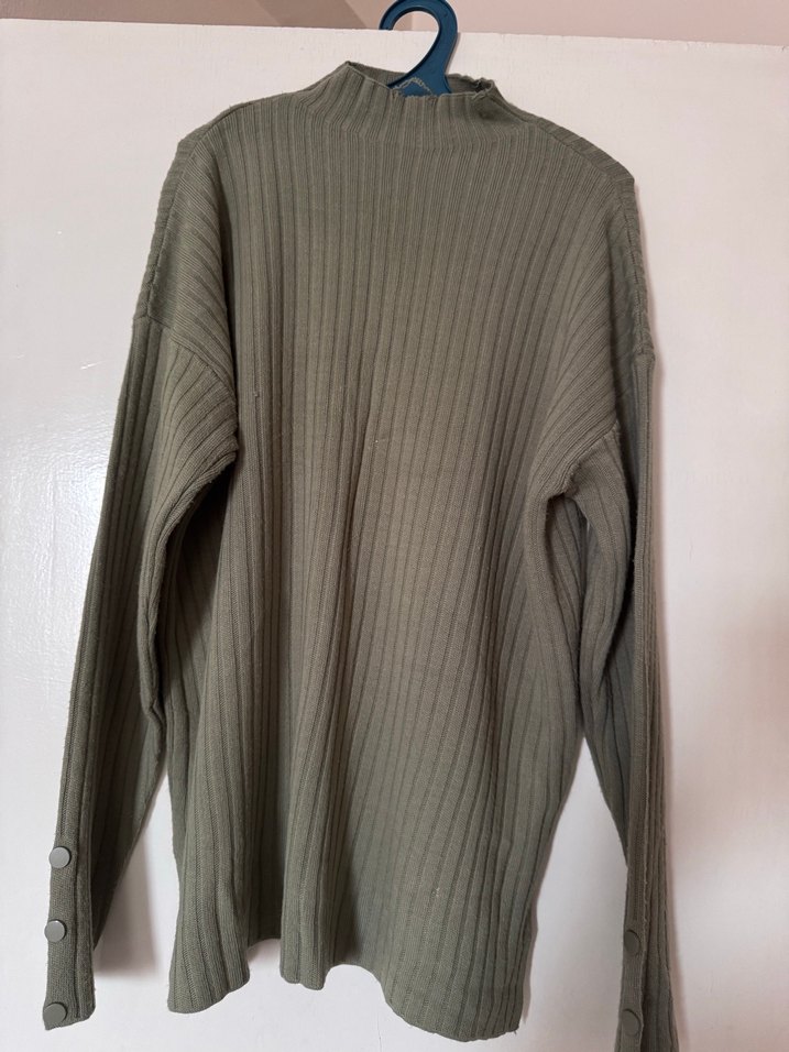 Haki kadın triko, boğazlı yaka ve düğmeli uzun kollara sahiptir. Yumuşak keten kumaştan üretilmiş, bol kesim ve normal midi boydur. Rahat ve gündelik tarz için uygundur.